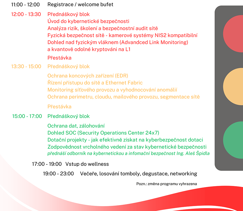Setkání CyberSignals propojuje strategii, technologie a provozní bezpečnost do jednoho přehledného formátu. Barevně strukturovaný program vás provede od identifikace rizik přes výběr správných nástrojů až po budování odolné infrastruktury včetně možností získání dotací. Naučte se číst signály dříve, než se z nich stanou incidenty.