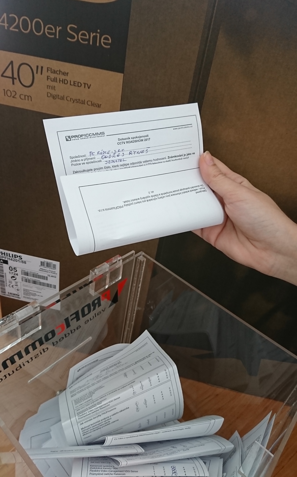Děkujeme Všem účastníkům CCTV ROADSHOW 2017, kteří nás v Praze, Brně a Bratislavě navštívili. Kromě výherců, kteří nám vyplnili zákaznickou anketu a vyhráli věcné ceny přímo na semináři, byl 1.11. naší asistentkou vylosován také výherce hlavní ceny - 40" Full HD LCD TV Philips. Výherce byl vylosován z celkového počtu 87 vyplněných dotazníků a stal se jím pan Ondřej Ryneš, kterého budeme kontaktovat ohledně předání ceny.